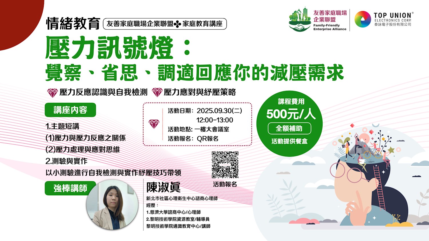 泰詠工安衛中心與教育部共同推動「友善家庭職場企業聯盟」,特別邀請新北市心理衛生中心諮商_陳淑貞心理師蒞臨公司,舉辦午間家庭情緒教育講座,【壓力訊號燈:覺察、省思、適應回應你的減壓需求 】,透過自我檢測覺察、省思、調適回應壓力需求,您千萬別錯過這場特別的情緒教育講座!!
